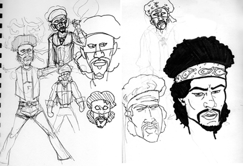 With that bravado and cockiness as fuel I began sketching out his look. I tried bell bottom pants for him and frilly cuffs for his shirt sleeves but that was still saying Rock Star and not Super Hero. The one thing from his signature look that I could borrow from to make him a super hero was his bandana. I just rolled the headband down over his eyes and added some goggle lenses and boom, Super Hero. But nothing really came to me though that said Voodoo child and the Internet wasn’t working so well, so researching the symbolism of Voodoo wasn’t going to work out. Also I couldn’t get  the Marvel character Brother Voodoo out of my head. Below are some rough ideas/sketches.
