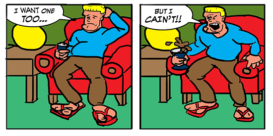 Hey folks! Mind if I ask for a two-panel thing? Imagine a dumb middle-aged guy, looks a bit like Woody Harrelson with a crew cut. In the first panel he’s all listless, you know, just kind of out of it, and he’s saying “I want one too…” But then in the second panel he bursts into anger, and he’s shaking his fists and quivering with his eyes bulging out and everything. He’s shouting, “BUT I CAIN’T!!” I’d really appreciate it if somebody could draw that for me. Thanks in advance!I thought it would be a fun exercise, so I whipped this up in about half an hour or so.